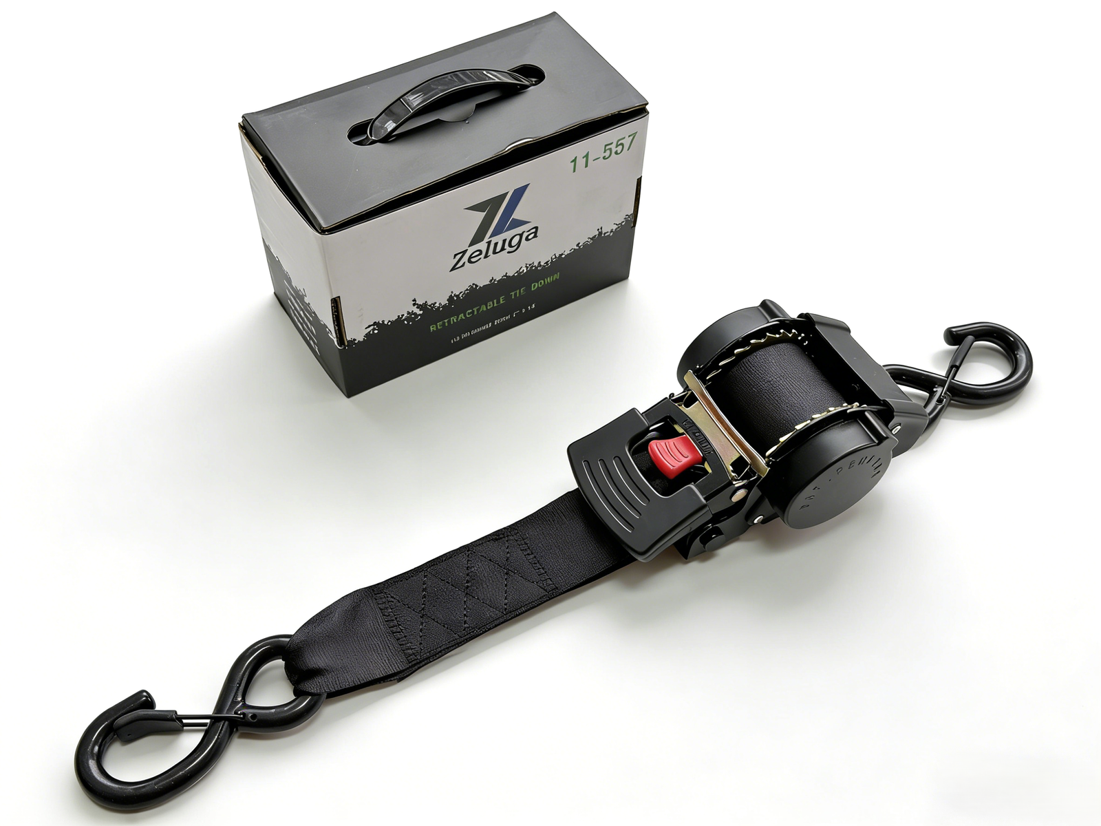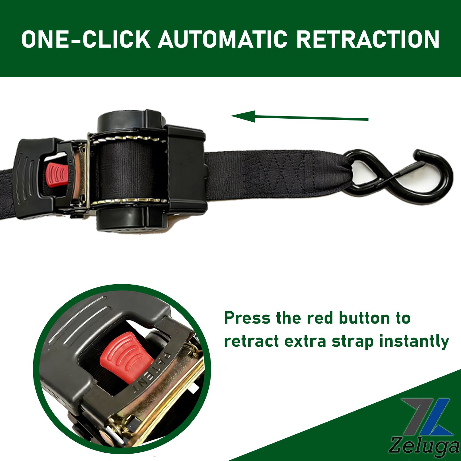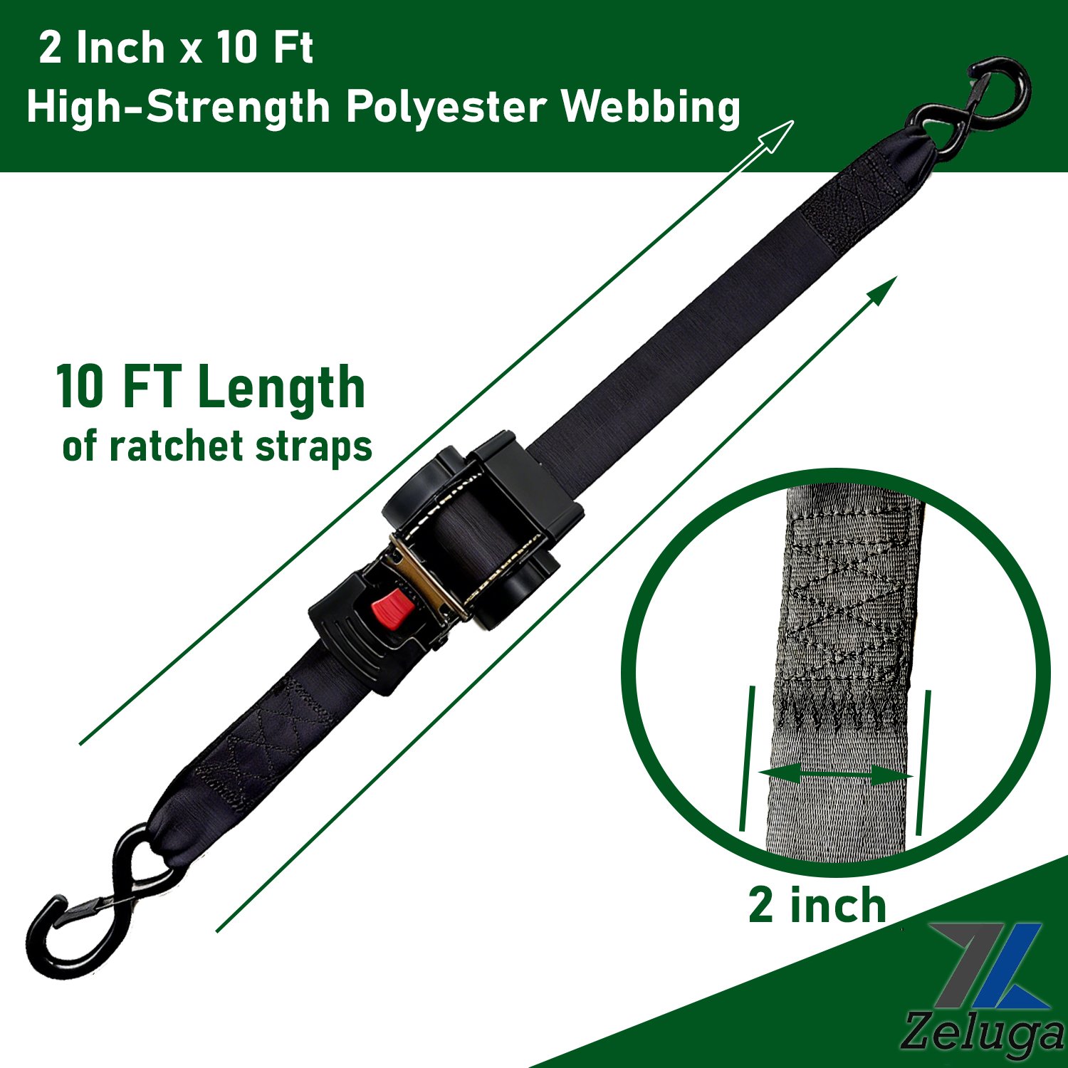 Zeluga 11-557 Heavy Duty Ratchet Straps 2 Inch x 10 Ft – 4400lbs Break Strength, for Truck & Cargo Trailer – Auto Self Retracting Tie Down Straps with Safety S Hooks