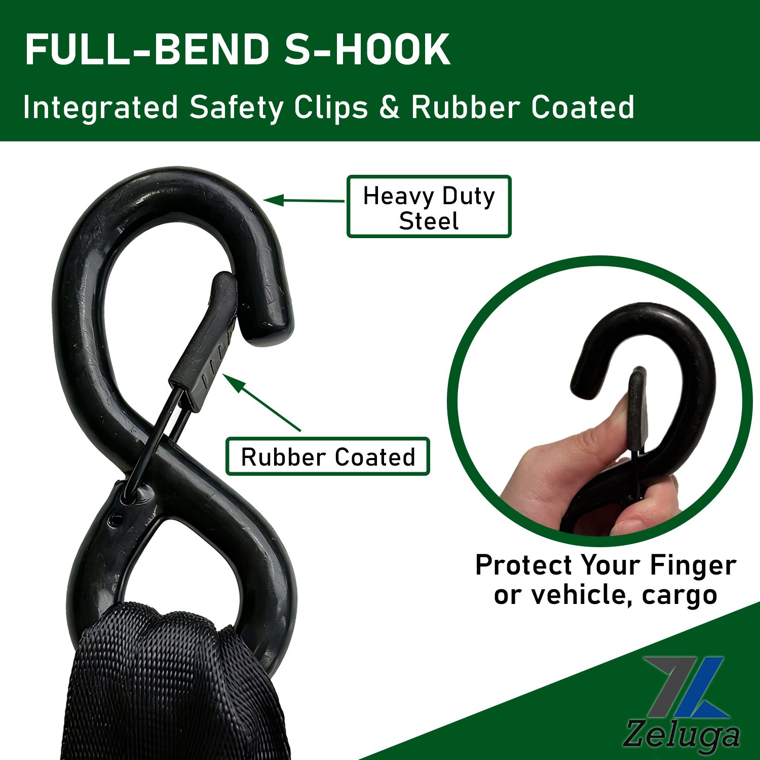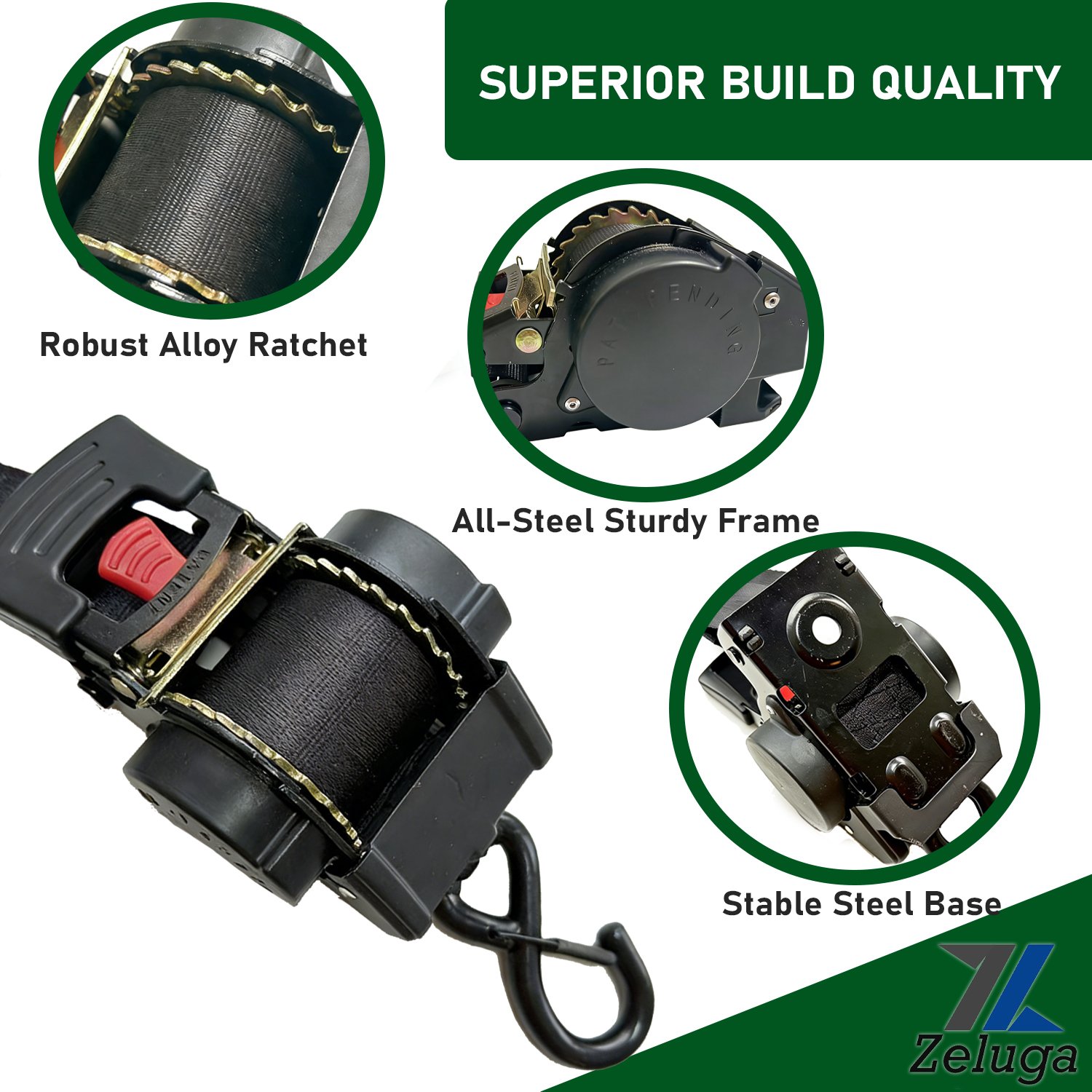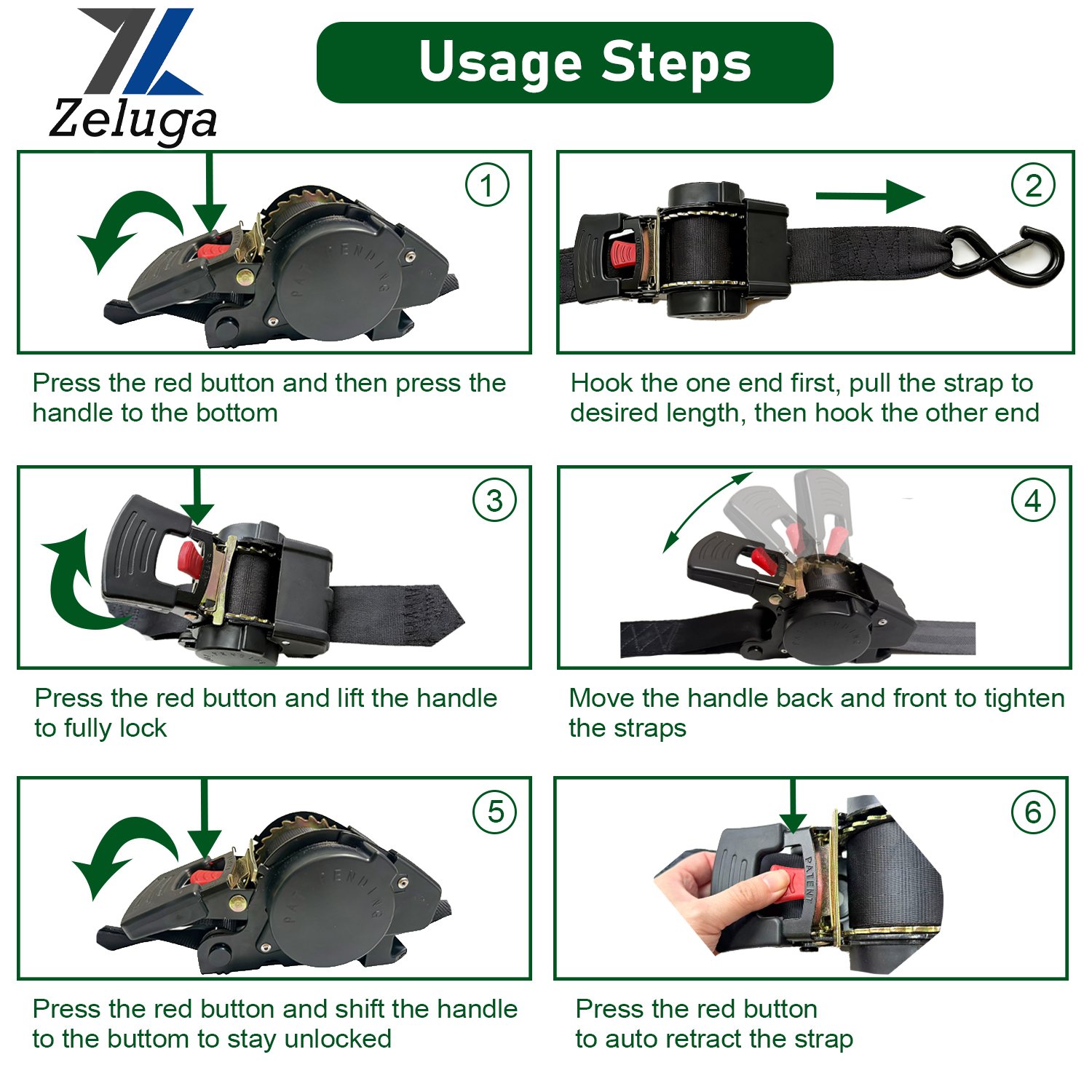Zeluga 11-557 Heavy Duty Ratchet Straps 2 Inch x 10 Ft – 4400lbs Break Strength, for Truck & Cargo Trailer – Auto Self Retracting Tie Down Straps with Safety S Hooks