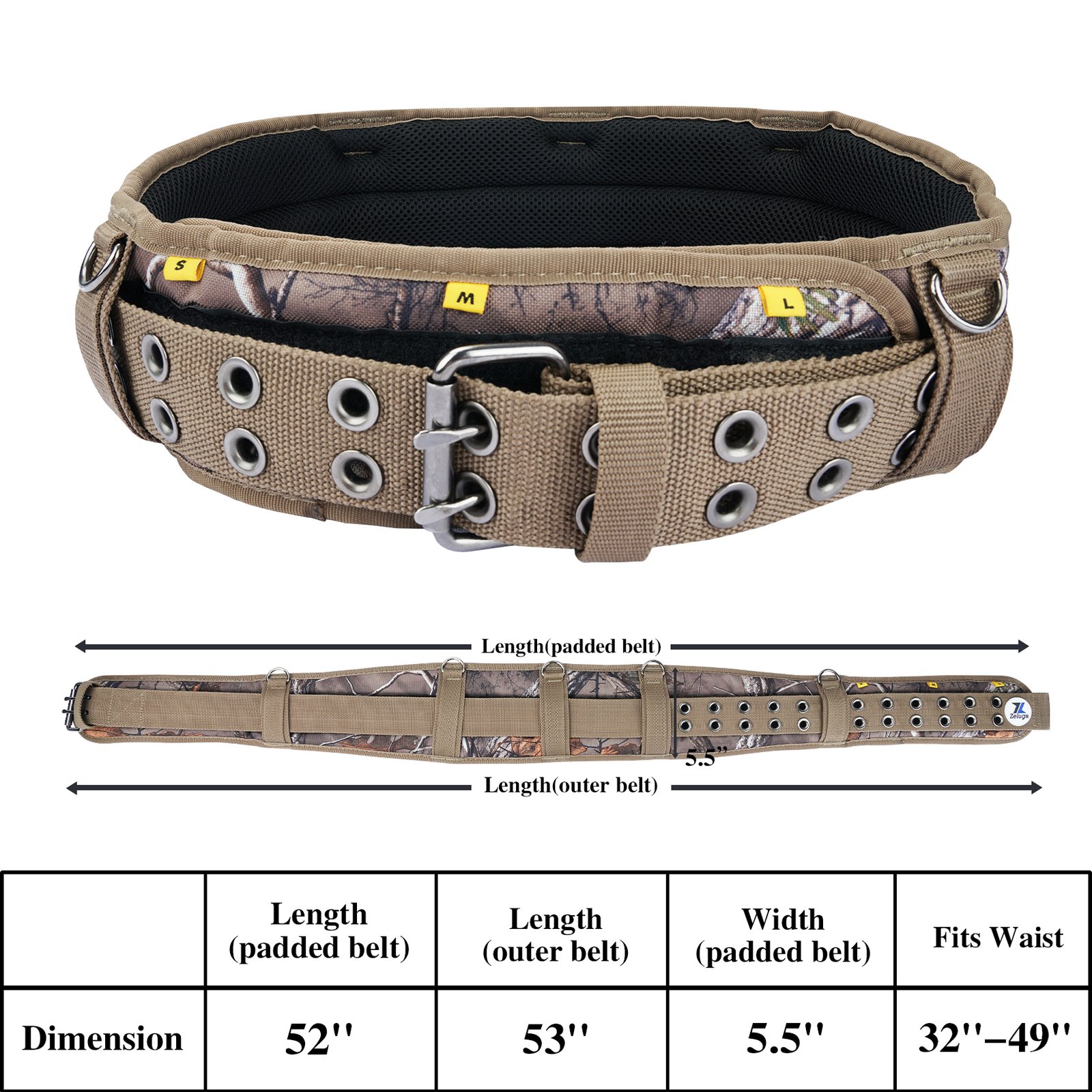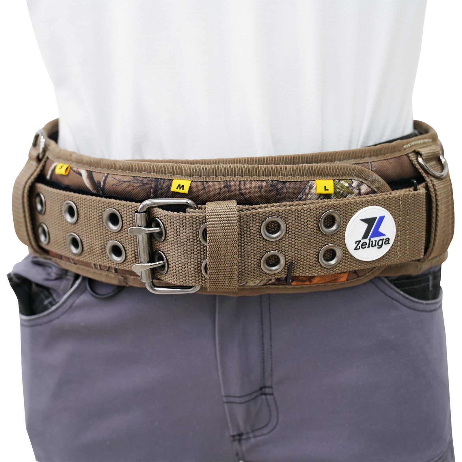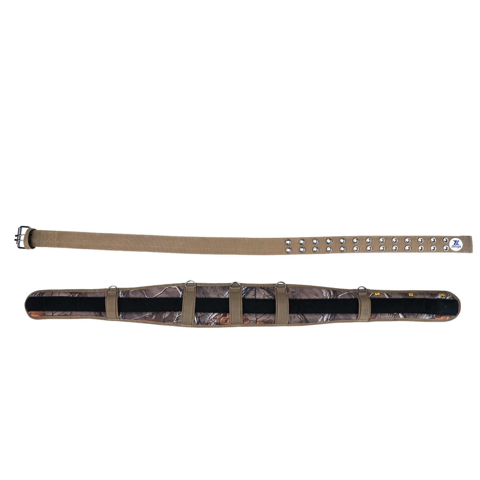 Zeluga 20-565 Camo Work Belt with Eyelets, Heavy Duty 4″ Padded Tool Belt with Adjustable Size & D-Ring Loops, Utility Tool Belt for Construction, Carpenter, Electrician, Framer, Fits Waist 32″-49″